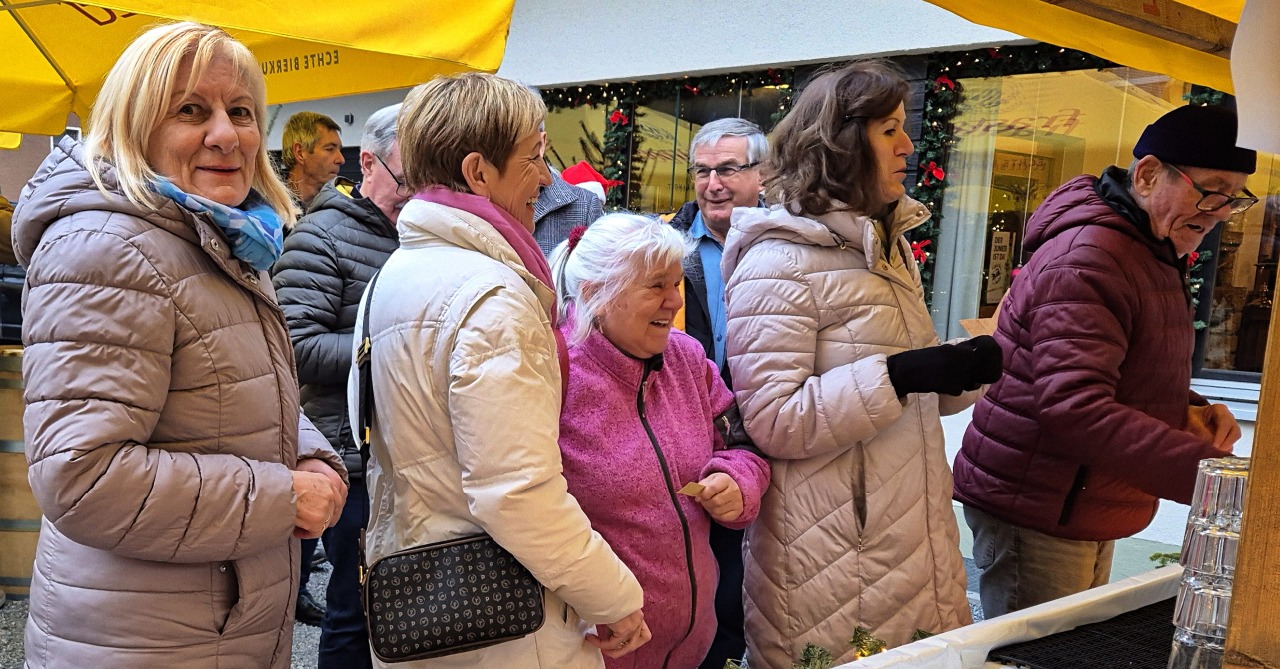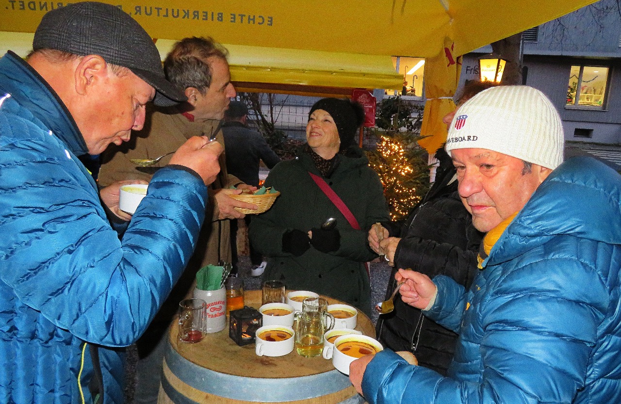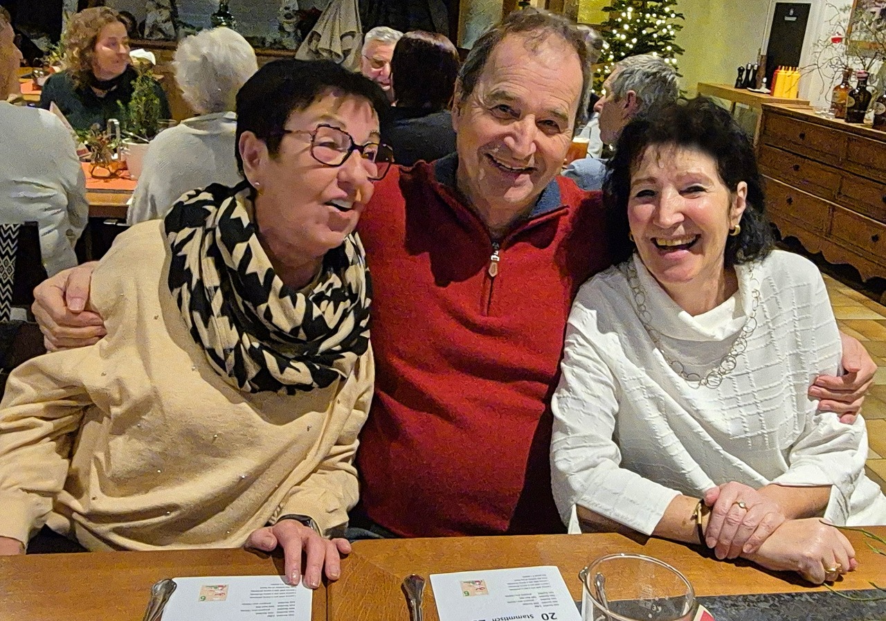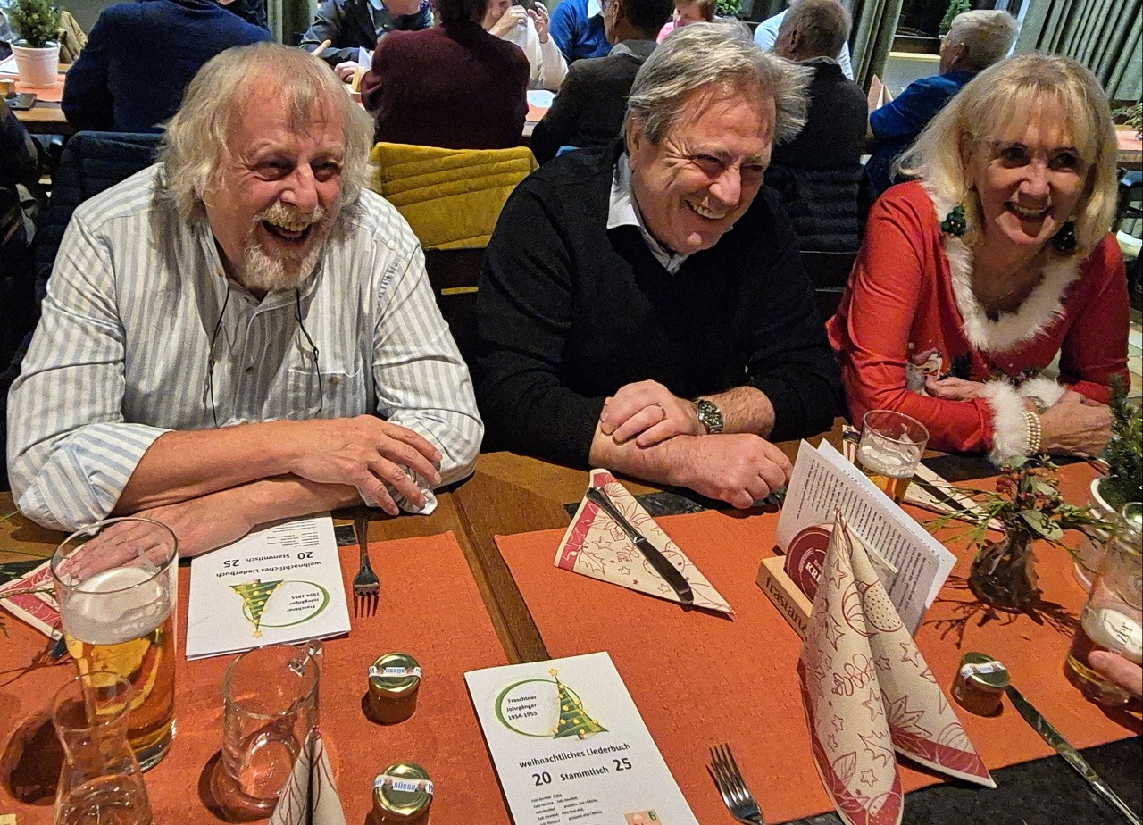 Unser letzter Stammtisch im Jahre 2025 war gleichzeitig unsere Weihnachts-Jahresabschlussfeier! 45 feierlich gestimmte Jahrgänger trafen sich im Punschgarten vom Braugast Kreuz. S'Usschüssle hat alle zu einer feinen Kürbiscremesuppe und Glühwein oder Most eingeladen. Anschließend zügelten wir in den schön geschmückten Saal. Nach der Begrüßung von Peter wurde das Weihnachtliche Liederbuch eingeweiht, unter der Leitung von unserem Musicus Herbert, durften alle kräftig mitsingen. Nächster Programmpunkt war dann: Wie das Usschüssle entstand. Marilyn und Hadwig erzählten die Erinnerungen seit dem Jahre 1976. Herbert hatte dann wieder schöne Lieder bereit und war erfreut, wie gesangsfreudig seine JahrgängerInnen waren. Große Überraschung brachten unsere Barbara und Brigitte mit: senationelle handgemachte Schwarztee Seifen für alle! Auch Lothar hatte seine Frau wieder überredet, für uns feine Keksle zu backen. Honig Werner ließ es sich auch nicht nehmen, wieder eine süße Portion Honig für uns abzufüllen. Rechtzeitig für den Rückblick und die Vorausschau ist dann Walter eingetroffen. Wir konnten nochmal auf ein tolles Jahrgängerjahr zurückblicken mit viel Eindrücken und können gepsannt sein, was das Jahr 2026 alles mit uns vorhat. Bereits im April werden wir unseren 100. Stammtisch feiern können. Und natürlich gibt es im Juni wieder einen sensationellen Ausflug! Nach dem offiziellen Teil wurde dann noch dem leiblichen Wohl gefrönt! So wurde das alte Jahr harmonisch verabschiedet mit viel Vorfreude, was im Neuen wohl kommen mag.