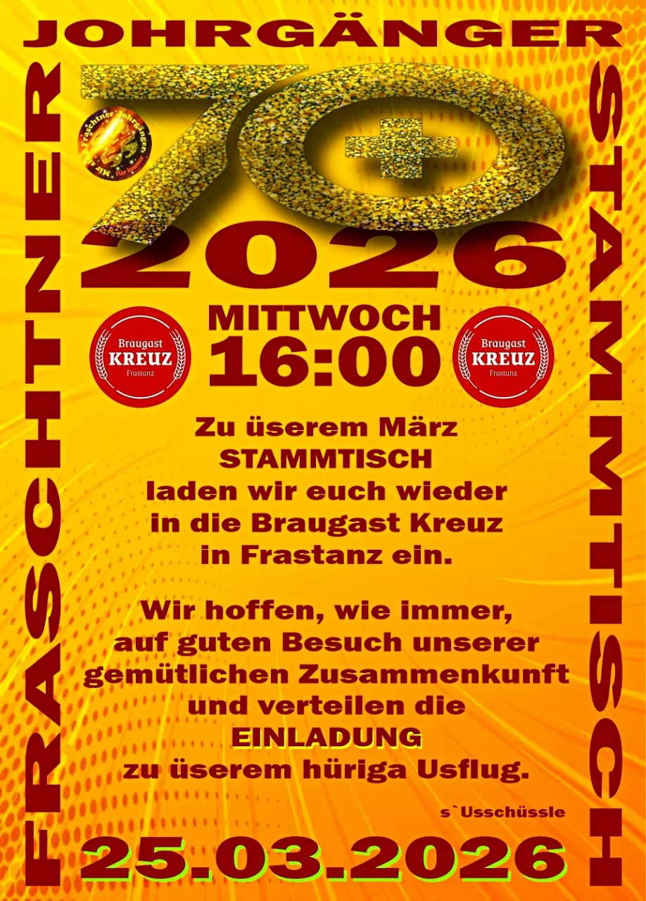 Wir können sagen - ein guter Start ins neue Jahr 2026 mit 31 Johrgänger im Kreuzsaal. Es wurden die Einladungen zum Einzahlen unseres Jahresobolus verteilt und sämtliche Neuigkeiten aus dem Dorf lautstatrk ausgetauscht. Unser Peter hat auch nohmals das Datum unseres heurigen Ausflug bekannt gegeben - 16. - 18. Juni 2026 nach ........... oh sorry, ischt uns jetzt grad entfallen wo`s hingeht! Nach diesem gemütlichen Nachmittag konnten die noch verbliebenen Johrgänger auf dem Großbildschirm das Nightrace von Schladming live mitverfolgen. Wir freuen uns schon auf alle Aktivitäten im neuen Jahr und hoffen natürlich auf immer zahlreiche Teilnahmen.